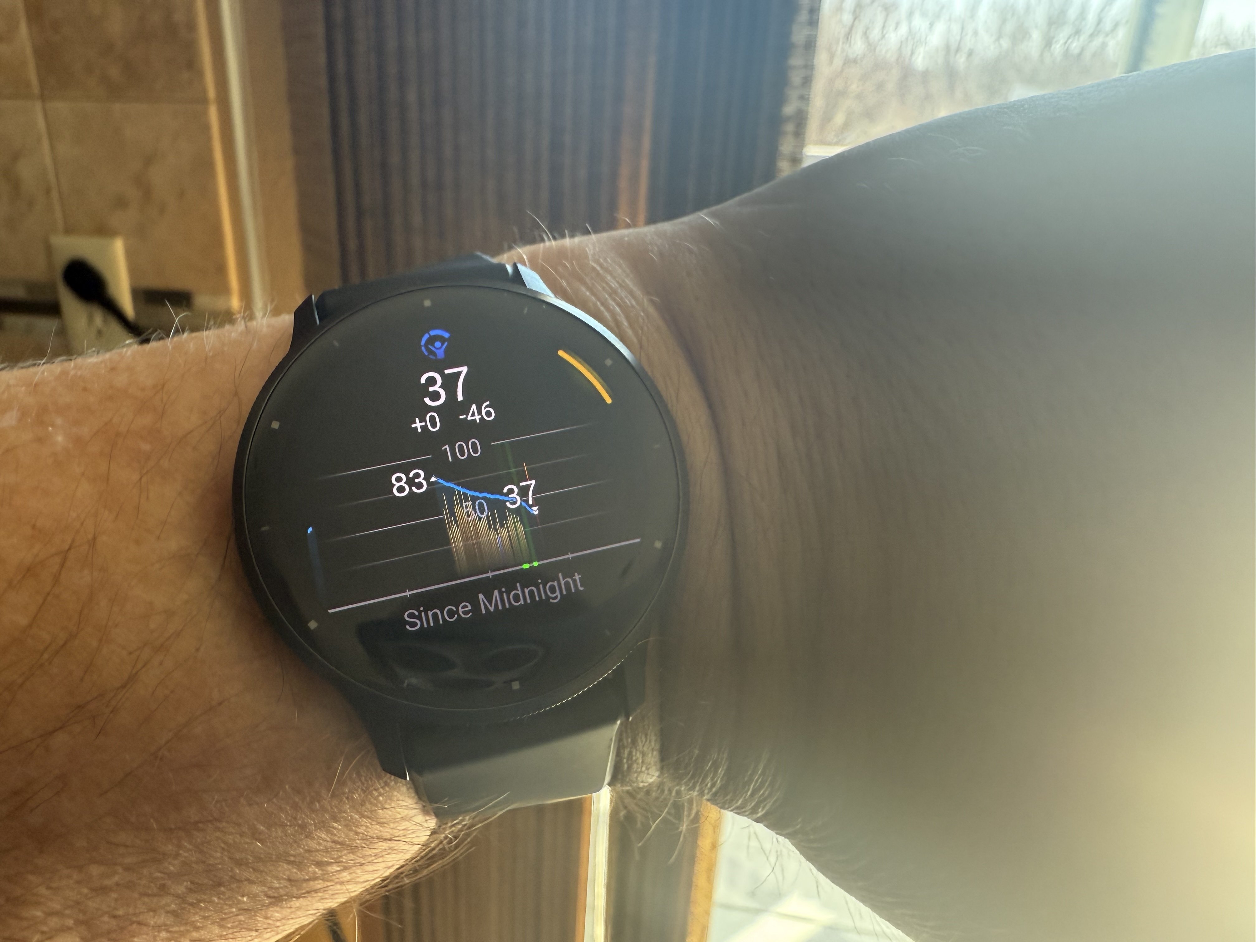 이 시계는 풍부한 건강 및 운동 데이터를 제공하며, 일일 걸음 수와 심박수를 알려주는 것을 훨씬 뛰어넘습니다. 예를 들어, 베뉴 3는 이 세대의 새로운 기능인 낮잠을 자동으로 감지하고 심박 변이도(HRV), 스트레스 수준, 밤샘 수면의 질, 활동 데이터와 함께 이를 바디 배터리 점수에 반영합니다. 시계 화면에서 바디 배터리 아이콘을 길게 누르면 하루 종일 에너지 수준을 보여주는 멋진 그래프가 나타나는데, 이 기능이 정말 마음에 들었습니다.